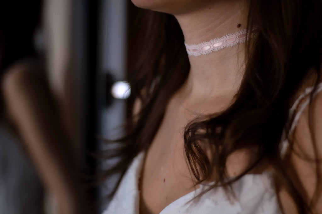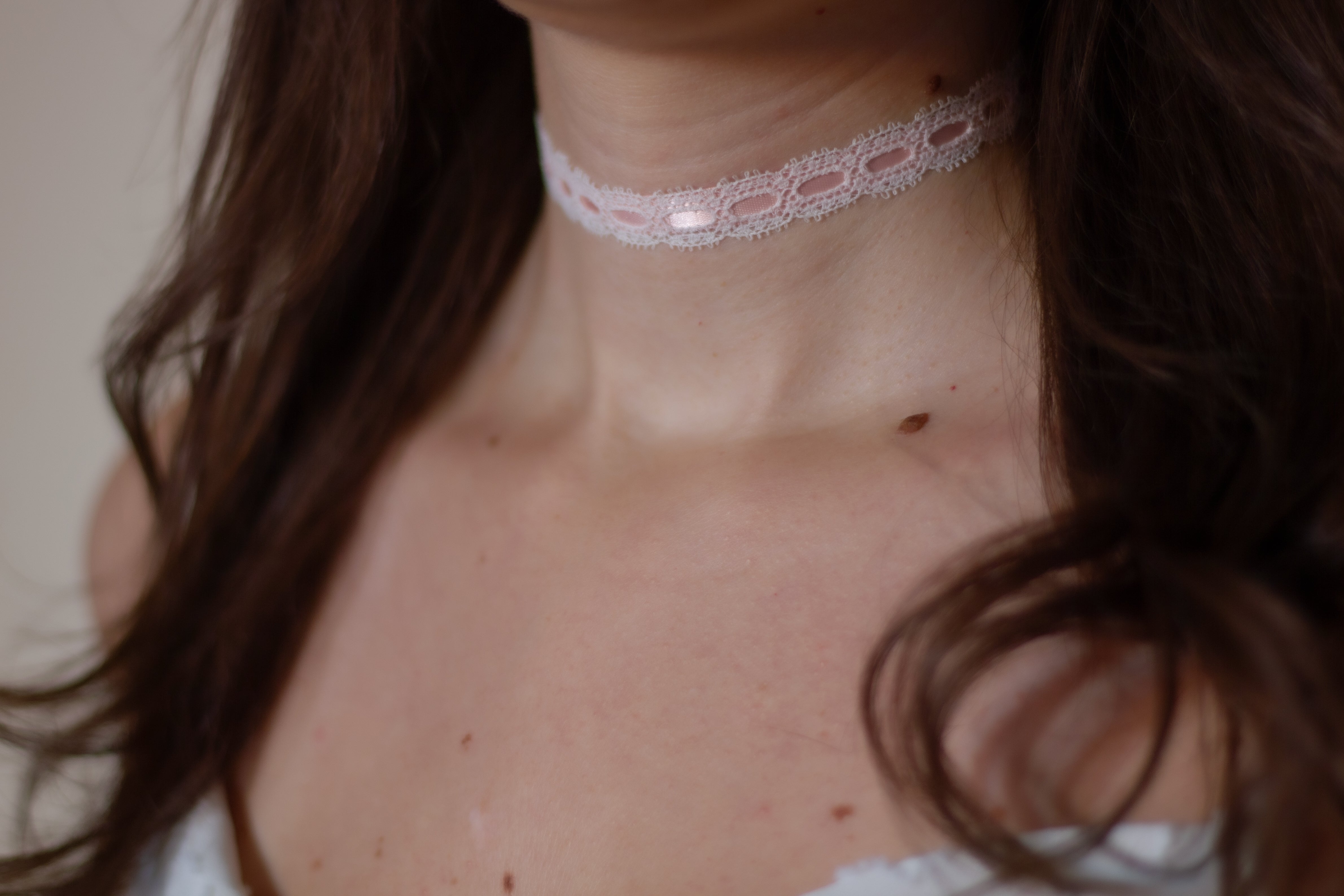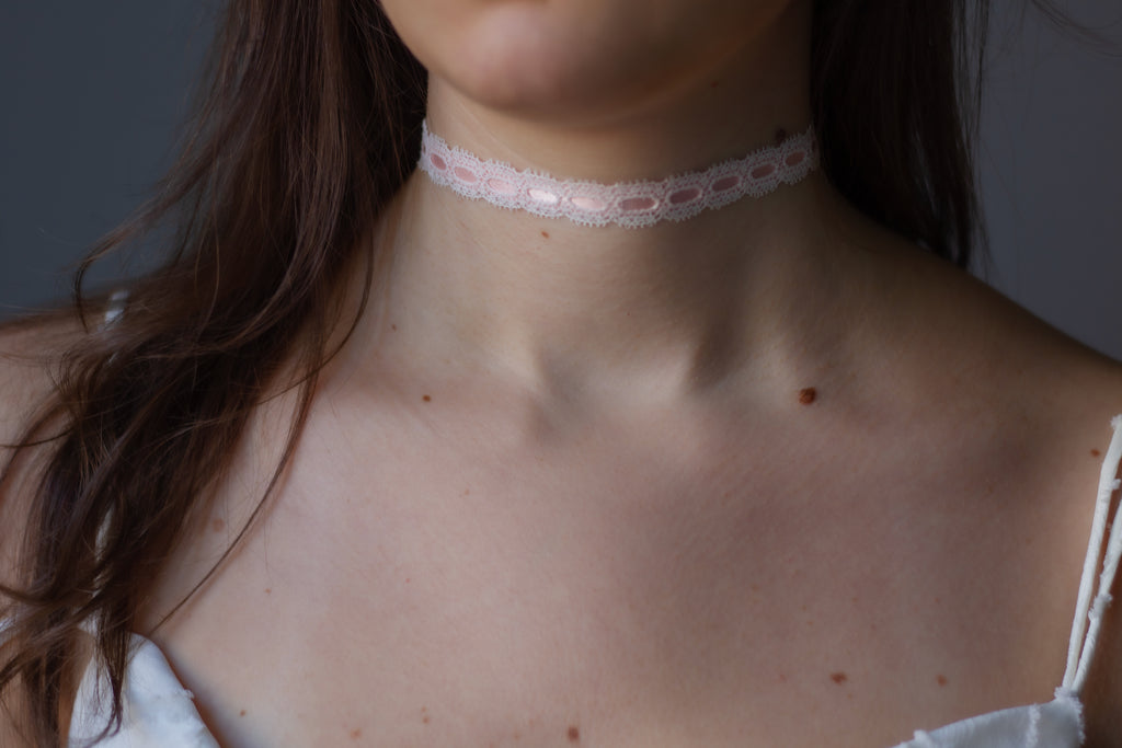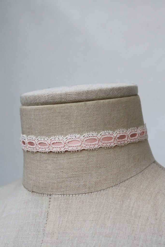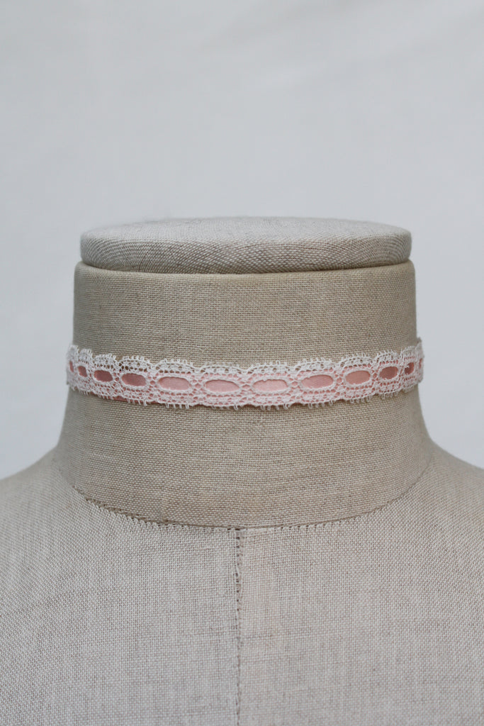 he 'Veronica' Choker is a vision of soft femininity — a delicate band of intricate white lace woven with a slender, blush-hued satin ribbon. This design embodies gentle romance and grace, sitting lightly against the neck like a cherished secret.